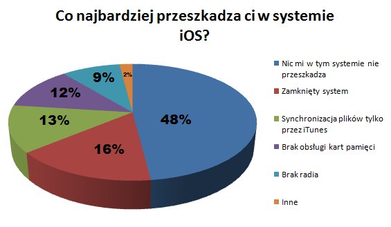 A ilu użytkowników uważa iOS za system bez żadnych wad? Całkiem sporo. W przypadku iOS 48 procent ankietowanych odpowiedziało, że nic im w tym systemie nie przeszkadza. Jeśli chodzi o Android i Windows Phone było to odpowiednio 34 i 9 procent.