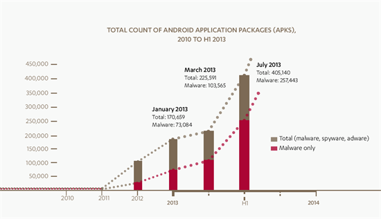 Liczba dziesięciu milionów jest wystarczająco zatrważająca, ale niestety prawdopodobnie będzie rosnąć. Tempo, w jakim na rynku pojawiają się kolejne szkodliwe aplikacje uwidacznia poniższy wykres:
